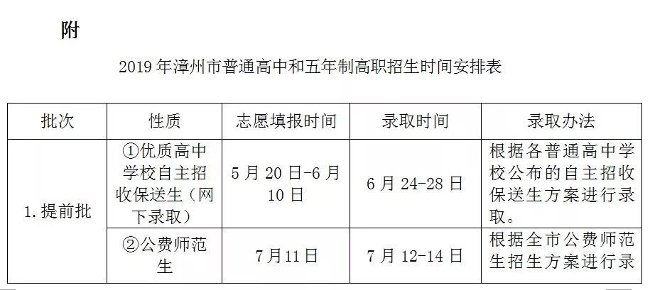 全市中招录取实行统一管理平台:“漳州市中招管理系统”。全市普通高中和五年制高职(含公费师范生)录取分为提前批(含自主招生、公费师范生和艺体特长生)、普高统招批、民办高中自主招生批、五年制高职批四个批次进行招生投档录取。